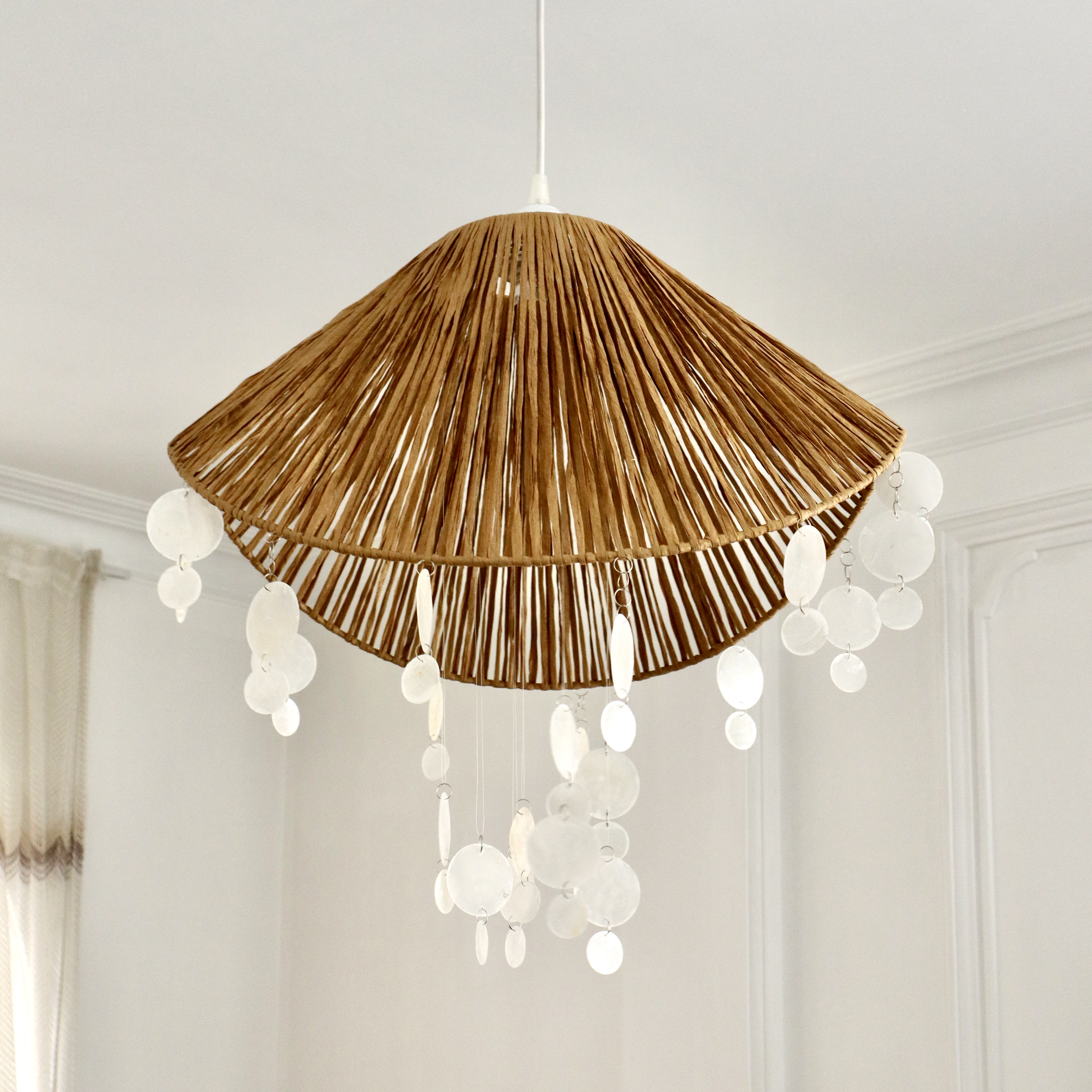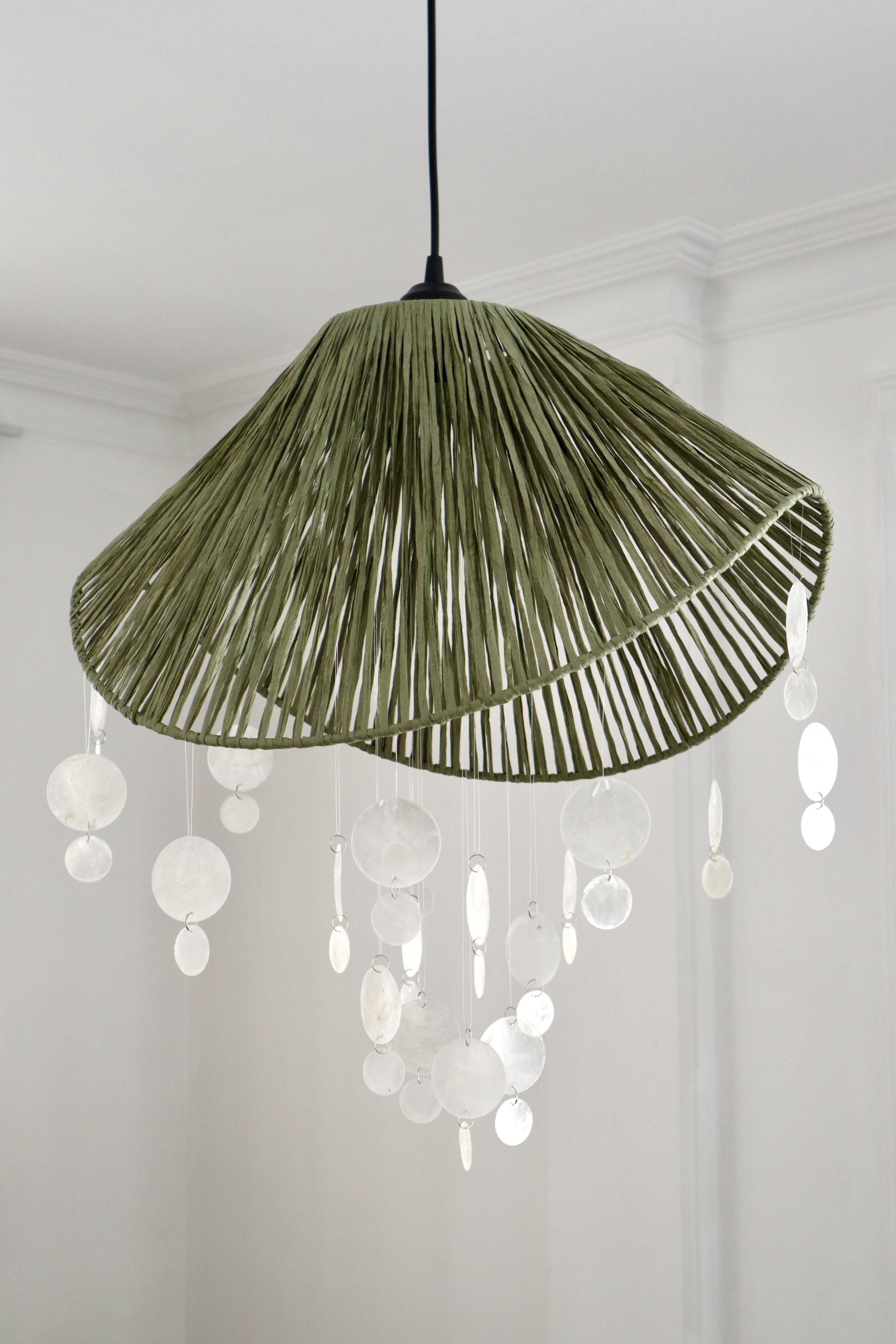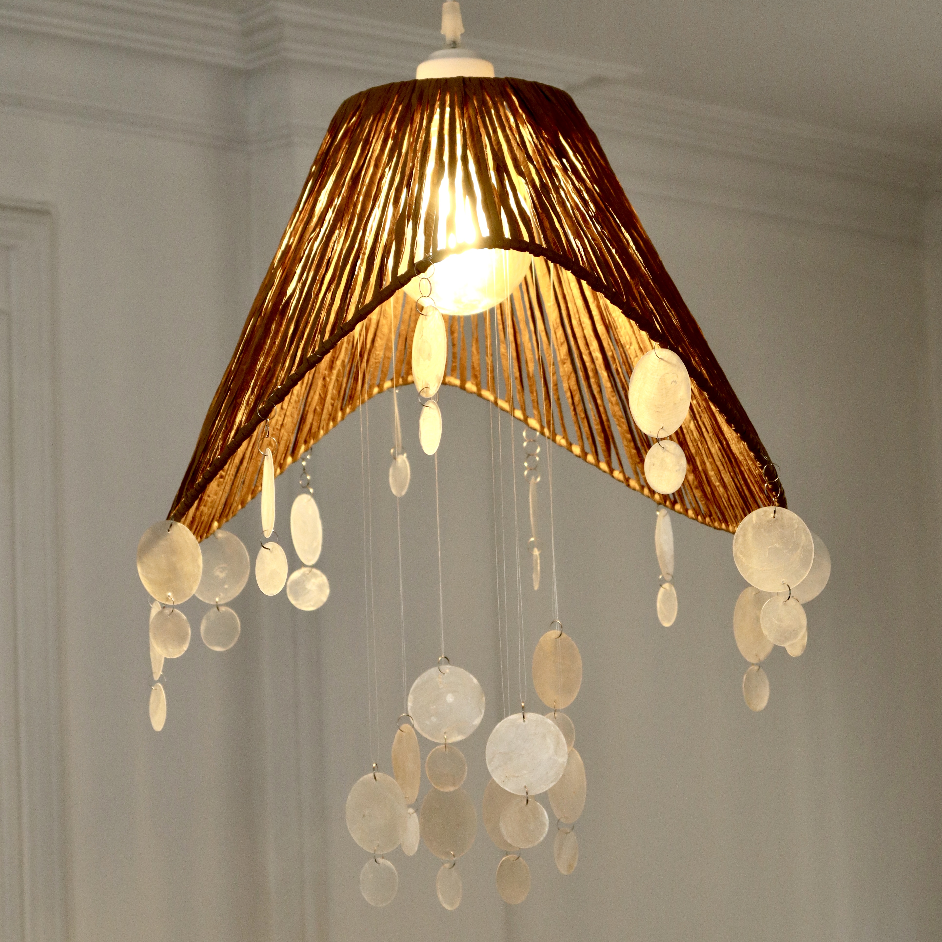 لوستر کلاهی بافته شده با نخ رافیا نواری صدری + صدف پولکی
